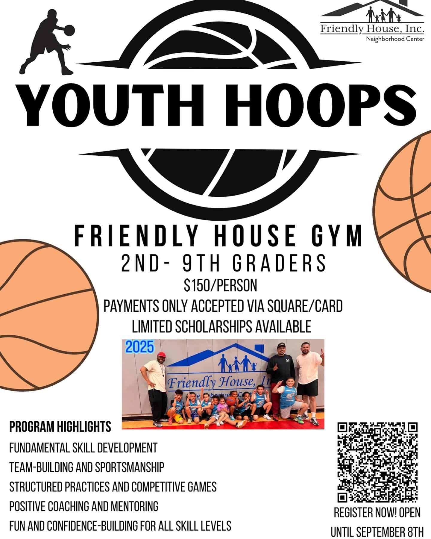 Youth Hoops is a 8-week instructional co-ed Basketball program for 2nd-9th graders. We currently have 3 divisions: 2nd-4th grade, 5th & 6th grade and 7th, 8th & 9th grade.